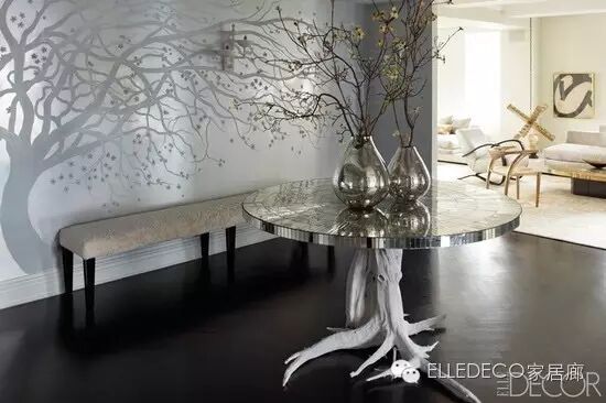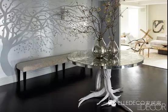 玄关空间仿佛奇幻森林的通道,墙面的树木光影由Bob George Studio设计并绘制。而桌子的细节设计也与墙面图案相呼应。