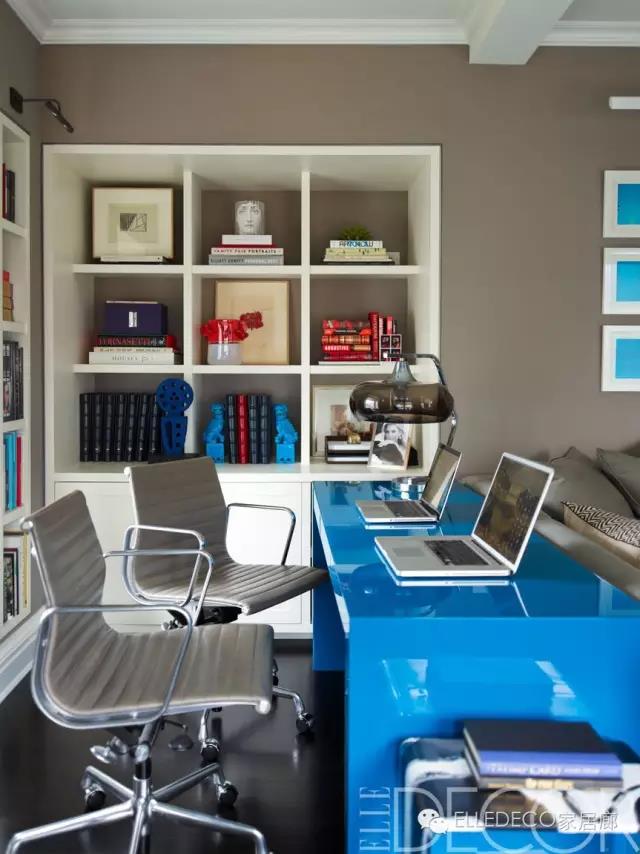 来到书房,是新婚夫妻共同打拼交流思想的空间。房间墙面选用沉稳的灰色系,令在空间中的人感受到安静的气氛,更加突显墙面的嵌入式书柜和蔚蓝色的艺术画作。